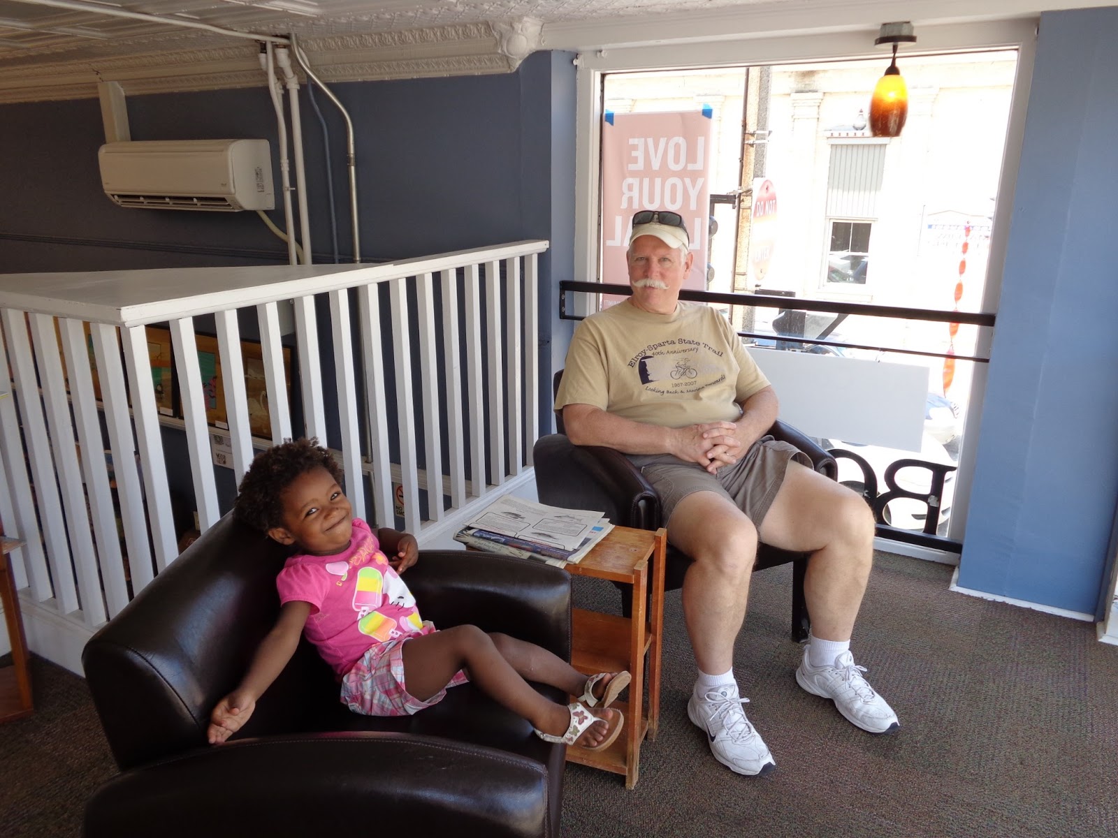 I was behind her and Paul for some of the trip and there are times when she pedals all by herself while Paul coasts. She gets a big kick out of working the bike all by herself. She also has a few tricks that she has taken on her road show. She will ride with her feet way out to the sides or with her hands off the handlebars.