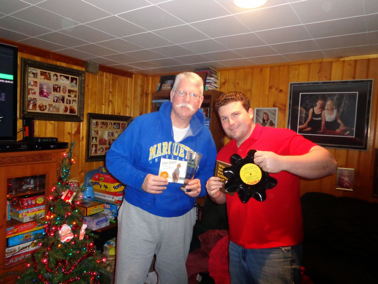 Nathan gave John a Jimmy Buffet CD and a Landshark beer glass while Nathan gave John a subscription to Atomic Ranch magazine, a Frank Sinatra record bowl, and a book about poop.